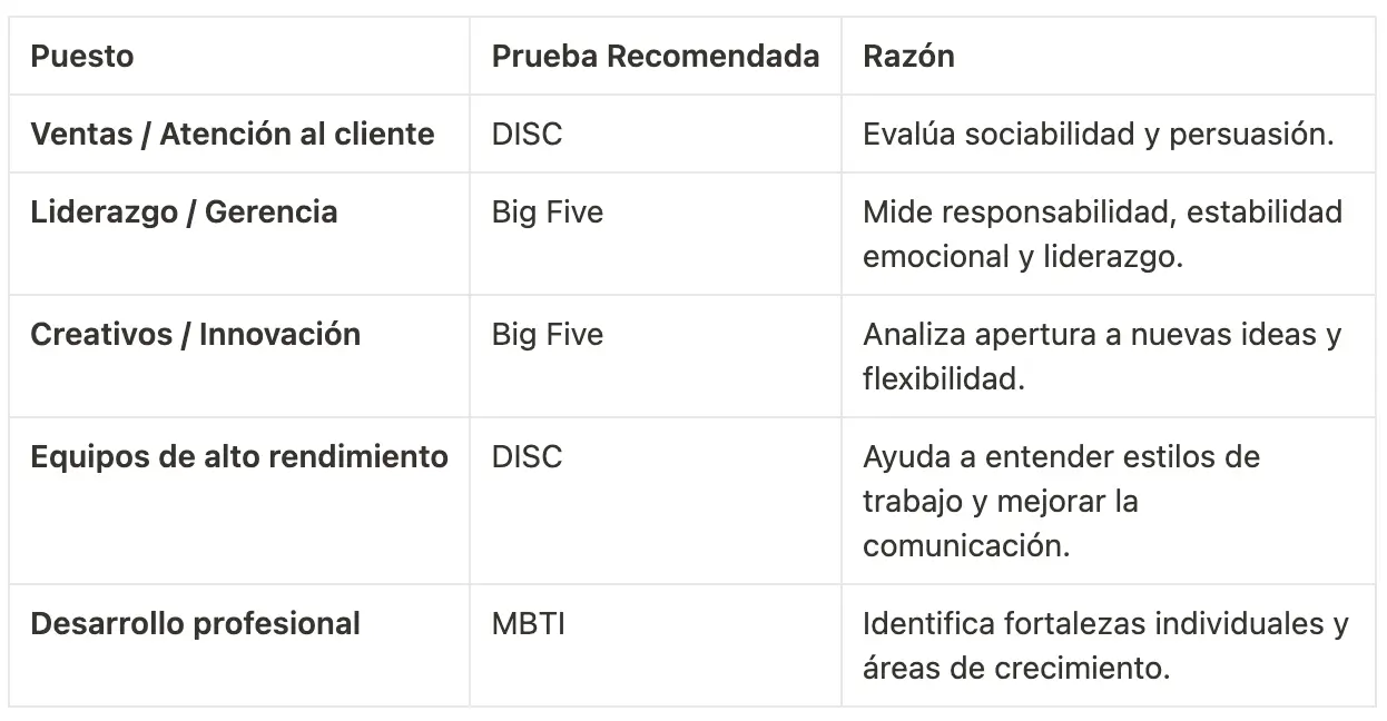 Si bien DISC, Big Five y MBTI son las más utilizadas, la mejor elección dependerá del tipo de puesto y de las necesidades específicas del proceso de contratación.